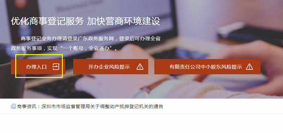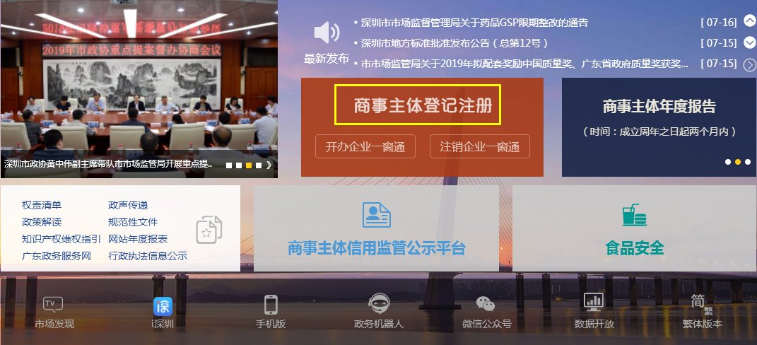 第一步:進(jìn)入深圳市市場監(jiān)督管理局官網(wǎng)http://amr.sz.gov.cn/,點(diǎn)擊網(wǎng)站主頁的商事主體登記注冊界面的“開辦企業(yè)一窗通”。