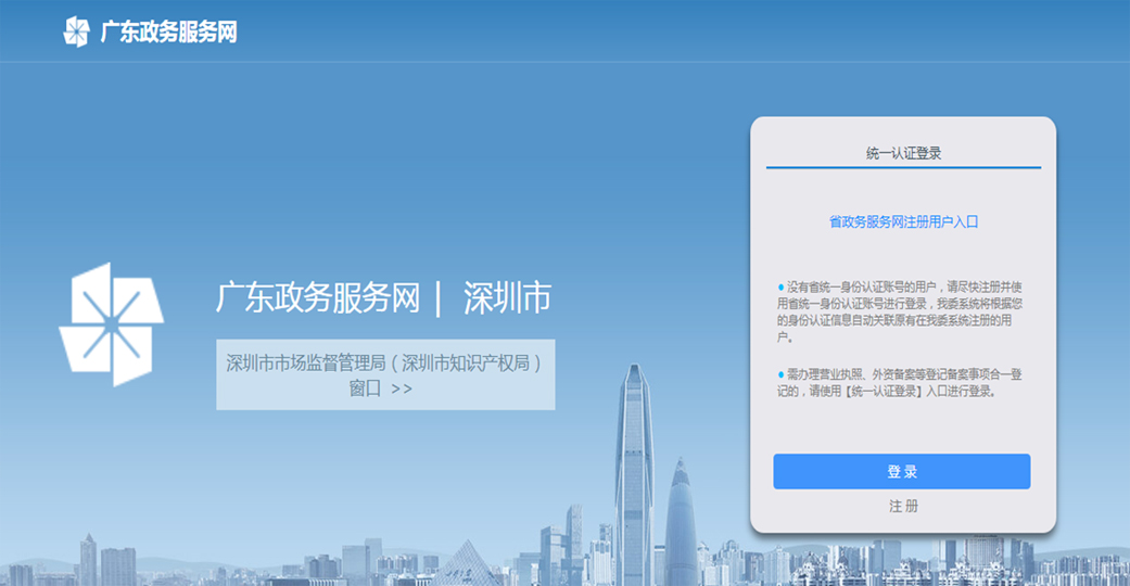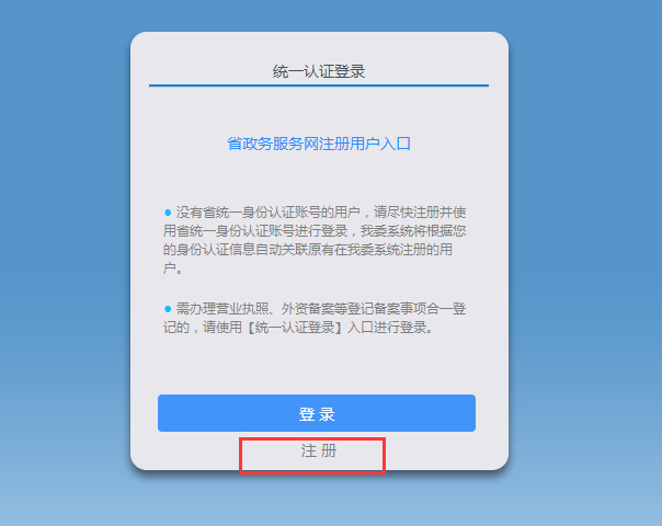 (注:1、沒有省統(tǒng)一身份認(rèn)證賬號的用戶,請盡快注冊并使用省統(tǒng)一身份認(rèn)證賬號進(jìn)行登錄,我局系統(tǒng)將根據(jù)您的身份認(rèn)證信息自動關(guān)聯(lián)原有在我局系統(tǒng)注冊的用戶。2、需辦理營業(yè)執(zhí)照、外資備案等登記備案事項合一登記的,請使用【統(tǒng)一認(rèn)證登錄】入口進(jìn)行登錄。)