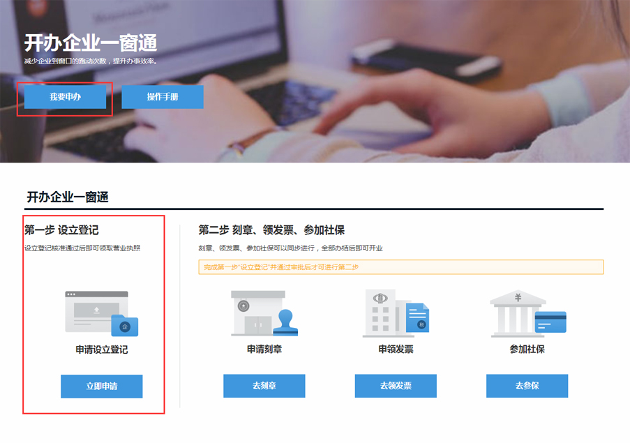 第二步:進(jìn)入“開辦企業(yè)一窗通”頁面后,點(diǎn)擊“我要申辦”或者“立即申請”
