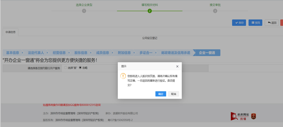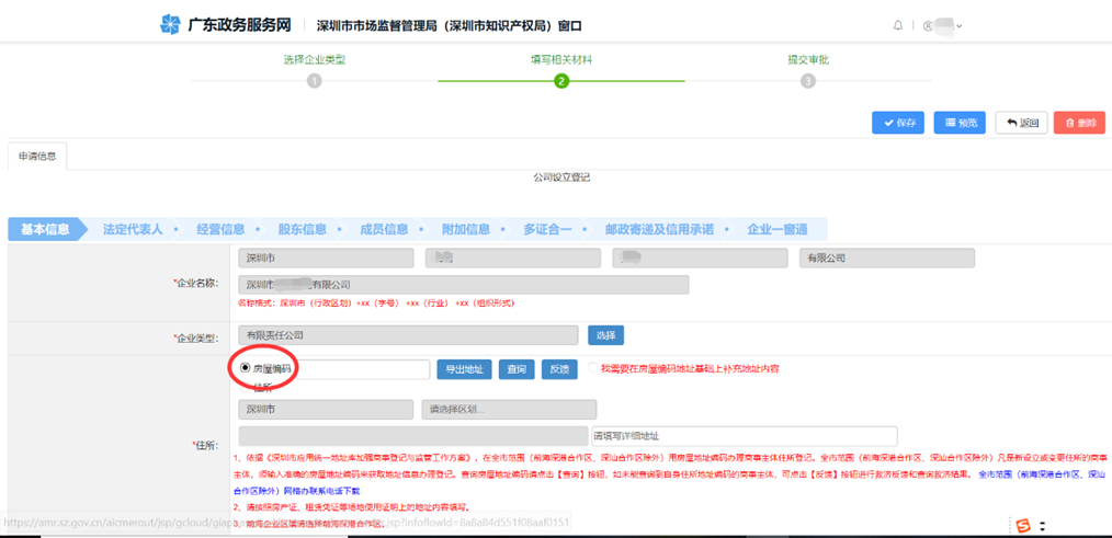 第五步:名稱申請成功后,按照提示填寫企業(yè)設(shè)立登記基本信息(企業(yè)住所需用25位房屋編碼導(dǎo)出)、 法定代表人、經(jīng)營信息、股東信息、成員信息、附加信息、多證合一等。