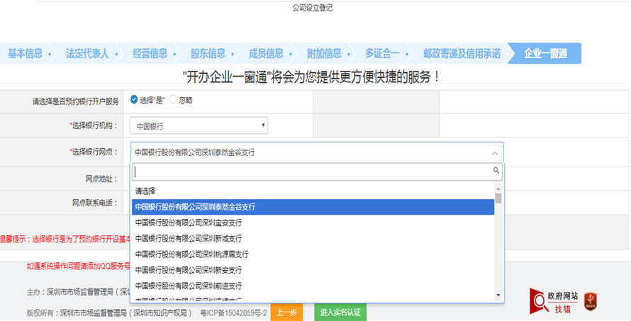 第六步:屬于有限責(zé)任公司的,可以選擇開辦企業(yè)一窗通的銀行開戶預(yù)約服務(wù) (目前可以預(yù)約深圳市內(nèi)所有的銀行網(wǎng)點(diǎn))。