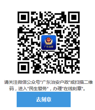 第十一步:點(diǎn)擊“去預(yù)約”,關(guān)注公眾號“廣東治安戶政”或掃描二維碼,進(jìn)入“民生警務(wù)”, 可以辦理“在線刻章”。