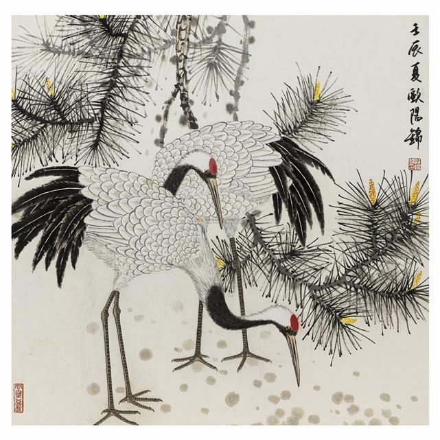 圖為在第十五屆文博會(huì)嘉長(zhǎng)源國(guó)際文化產(chǎn)業(yè)園分會(huì)場(chǎng)展示的歐陽(yáng)錦國(guó)畫(huà)作品《鶴》。