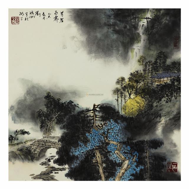 圖為在第十五屆文博會(huì)嘉長(zhǎng)源國(guó)際文化產(chǎn)業(yè)園分會(huì)場(chǎng)展示的劉鴻洲國(guó)畫(huà)作品《芳莊雨霽》。