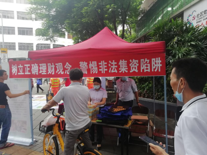 為落實(shí)轄區(qū)2020年度防范非法集資宣傳教育工作部署,引導(dǎo)廣大市民朋友選擇正規(guī)理財(cái)渠道投資,遠(yuǎn)離非法集資活動(dòng),積極舉報(bào)非法集資行為,形成全社會(huì)對(duì)非法集資群防共治的良好局面。2020年9月17日下午,沙頭角街道經(jīng)濟(jì)辦和江蘇銀行深圳沙頭角社區(qū)支行在沙頭角轄屬社區(qū)舉辦了“樹立正確理財(cái)觀念警惕非法集資陷阱”的宣傳教育活動(dòng)?;顒?dòng)現(xiàn)場(chǎng),為市民準(zhǔn)備了環(huán)保袋、雨傘、充電器等印有防范非法集資宣傳相關(guān)標(biāo)語(yǔ)的宣傳禮品,吸引了來(lái)往居民的駐足參與,現(xiàn)場(chǎng)氣氛活躍,大家踴躍參與問卷調(diào)查和有獎(jiǎng)問答。