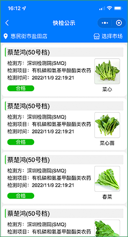 鹽田區(qū)智慧菜籃子以數(shù)字化賦能,由市場監(jiān)管部門督查監(jiān)管,通過在農(nóng)貿(mào)市場檔位上安裝視頻監(jiān)控、接入智慧計量數(shù)據(jù),引入市場檢測數(shù)據(jù),匯總智慧化數(shù)據(jù)和視頻,形成農(nóng)貿(mào)市場運行監(jiān)測大數(shù)據(jù)平臺。讓檔鋪可看,菜品可查,菜源可溯,解決現(xiàn)有商業(yè)買菜平臺看圖下單、不可溯源、菜價不一、質(zhì)量問題等困境。讓市民通過鹽田智慧菜籃子小程序足不出戶就可輕松掌握鹽田農(nóng)貿(mào)市場菜籃子供應(yīng)情況和食品安全資訊,享受線上逛市場買菜;讓經(jīng)營者受到隨時的監(jiān)督,同時緊跟電商時代步伐,使“煙火氣”通過互聯(lián)網(wǎng)連接千家萬戶。