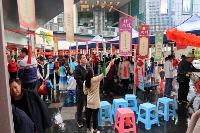 現(xiàn)場(chǎng)的燈謎區(qū)掛滿了各式各樣、色彩斑斕的燈謎,內(nèi)容涵蓋字謎、成語(yǔ)謎、文明禮儀及節(jié)日傳統(tǒng)風(fēng)俗等,吸引了眾多居民前來(lái)挑戰(zhàn)。大家或低頭沉思,或相互討論,試圖解開(kāi)一個(gè)個(gè)有趣的謎題。燈謎競(jìng)猜不僅考驗(yàn)了大家的智慧和才情,更增添了節(jié)日的趣味性和互動(dòng)性。