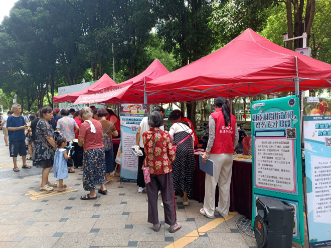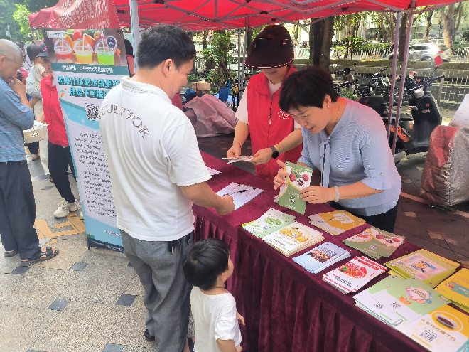 活動現(xiàn)場工作人員引導(dǎo)居民簽到領(lǐng)取集章卡進行游戲互動環(huán)節(jié),通過懸掛橫幅,派發(fā)食品安全科普手冊等,擺設(shè)食品安全知識展示板,設(shè)置食品安全宣傳手冊取閱欄等多種形式讓居民了解食品安全知識?;顒蝇F(xiàn)場播放食品安全廣播,設(shè)置食品安全趣味知識競答、膳食寶塔你我知、“食品安全大沖關(guān)”等游戲,工作人員向居民派發(fā)食品安全知識折頁,講解食品安全小知識,通過你問我答的形式與小朋友進行食品安全科普互動,讓小朋友和家長學(xué)會正確的飲食習(xí)慣,了解到科學(xué)的食品安全知識.