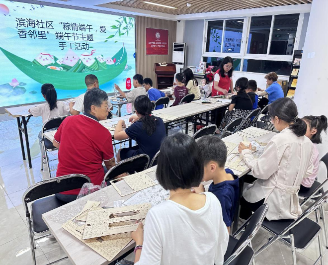 端午節(jié)之際,濱海社區(qū)組織開(kāi)展文化課堂及親子龍舟手工制作活動(dòng)。社區(qū)工作者借助生動(dòng)有趣的動(dòng)畫(huà)與故事,深入淺出地為孩子們講解端午節(jié)的起源、習(xí)俗及其蘊(yùn)含的愛(ài)國(guó)主義精神與民俗智慧。在龍舟模型拼裝環(huán)節(jié),親子家庭默契協(xié)作,親手制作象征團(tuán)結(jié)奮進(jìn)的龍舟模型,傳統(tǒng)技藝在體驗(yàn)中活化,文化根脈在互動(dòng)間延伸。此舉不僅讓孩子們領(lǐng)略了傳統(tǒng)文化的魅力,更在寓教于樂(lè)中增進(jìn)了親子關(guān)系,潛移默化播撒了文化自信的種子。