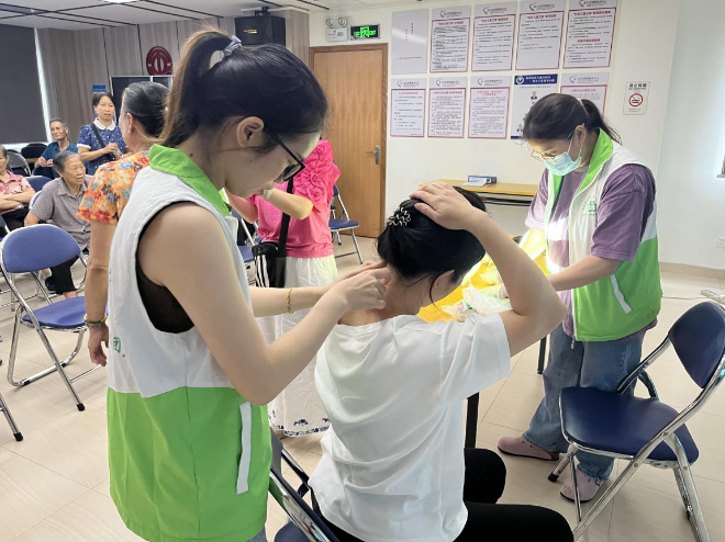 講座結(jié)束后,居民們?cè)诠ぷ魅藛T的引導(dǎo)下,有序排隊(duì)體驗(yàn)三伏貼貼敷。社康醫(yī)生們耐心地為每一位居民進(jìn)行體質(zhì)辨識(shí),根據(jù)個(gè)人體質(zhì)和健康狀況,選擇相應(yīng)的穴位進(jìn)行貼敷,并反復(fù)叮囑貼敷后的飲食禁忌、皮膚護(hù)理等注意事項(xiàng)。