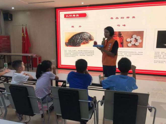 在活動(dòng)中,社工首先通過ppt,以簡(jiǎn)明易懂的語言為在場(chǎng)的小朋友志愿者與家長(zhǎng)志愿者介紹了毒品的種類、危害以及怎樣防范毒品等內(nèi)容。志愿者們對(duì)于學(xué)習(xí)內(nèi)容流露出濃厚的興趣,不但在聽講的過程中聚精會(huì)神,對(duì)于社工的提問也積極回答。隨后,社工還向大家展示了仿真毒品模型,同時(shí)讓小朋友寫出毒品的名稱,希望能將拒毒防毒的意識(shí)深深植入大家的腦海中。