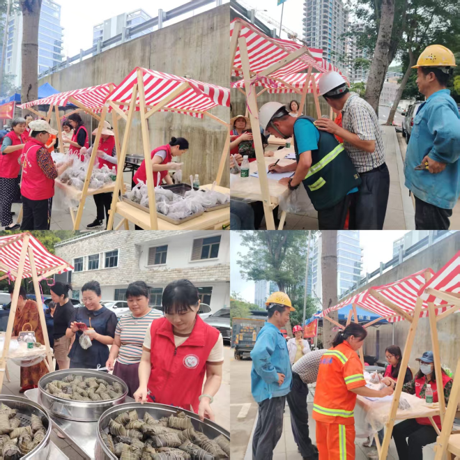 此外,社區(qū)還將溫暖傳遞給更多群體。老協(xié)代表、社工代表、村民代表和志愿者代表一起為消防站、環(huán)衛(wèi)工人、建筑工人送上粽子與節(jié)日問候,致敬他們的辛勤付出。