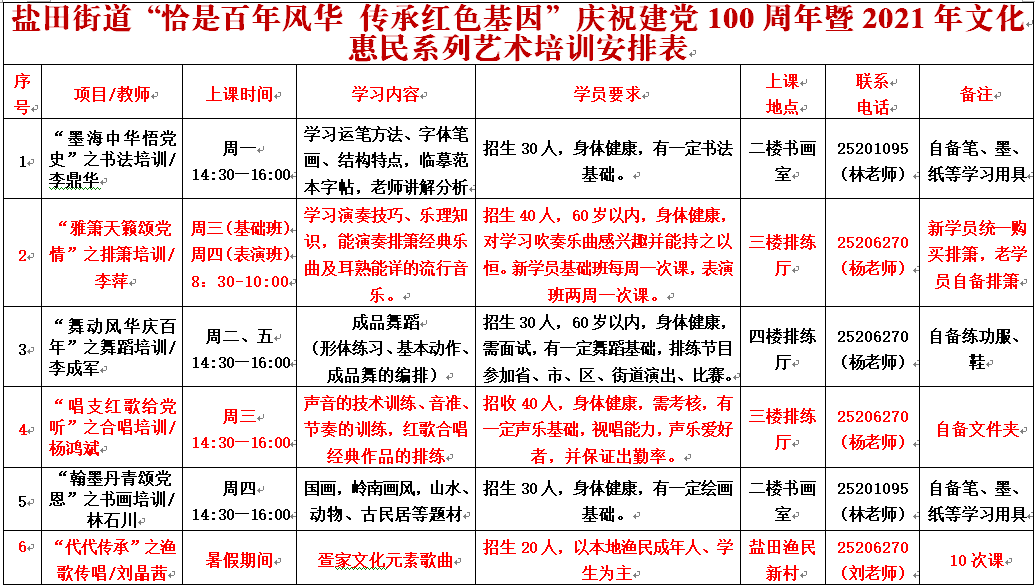 2021年,為隆重慶祝中國共產(chǎn)黨建黨100周年,鹽田街道積極唱響新時代主旋律,開展“恰是百年風(fēng)華 傳承紅色基因”慶祝建黨100周年暨2021年文化惠民培訓(xùn)系列活動。