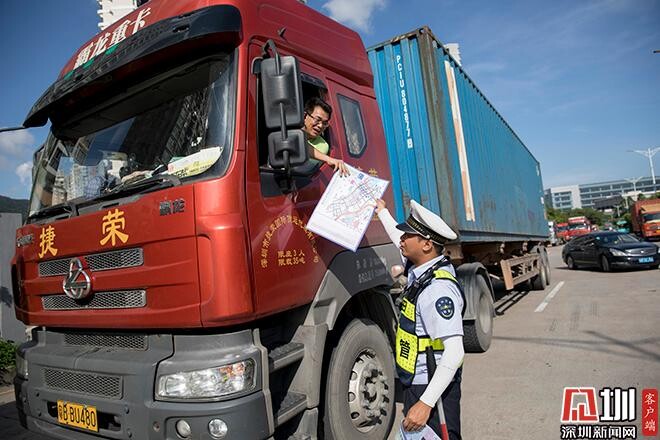 鹽田街道交通協(xié)管員向貨柜車司機派發(fā)停車地圖宣傳單張