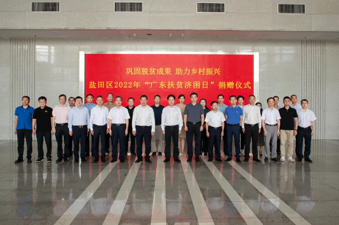 2022年9月22日上午,鹽田區(qū)舉行2022年“廣東扶貧濟困日”捐贈儀式,鹽田區(qū)委副書記、區(qū)長鄧飛波、區(qū)委常委、統(tǒng)戰(zhàn)部部長夏德鰲、副區(qū)長張雄漢、區(qū)慈善會會長高小波等領(lǐng)導(dǎo)同志出席活動,動員社會力量現(xiàn)場募捐,共有23家愛心企業(yè)代表上臺捐贈,籌集款物達987萬元,推進鹽田對口幫扶東源、凌云、樂業(yè)等脫貧地區(qū)持續(xù)鞏固拓展脫貧攻堅成果、推動鄉(xiāng)村全面振興,以實際行動迎接黨的二十大勝利召開。