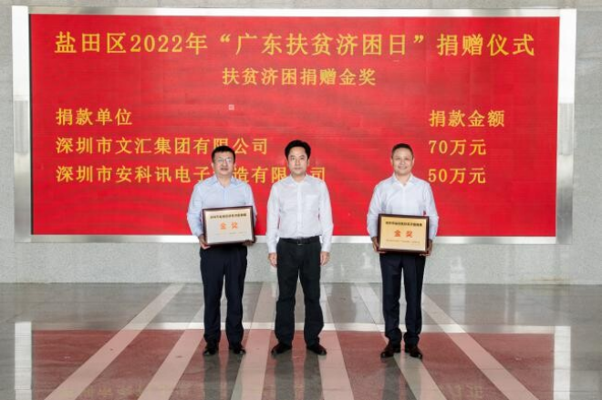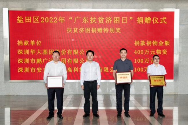 捐贈儀式現(xiàn)場,飛波、德鰲、雄漢等區(qū)領(lǐng)導(dǎo)分別為捐贈企業(yè)頒發(fā)愛心獎牌。深圳華大基因股份有限公司、深圳市鵬廣達集團有限公司、深圳市安多福消毒高科技股份有限公司被授予“鹽田區(qū)扶貧濟困捐贈特別獎”;深圳市文匯集團有限公司、深圳市安科訊電子制造有限公司被授予“鹽田區(qū)扶貧濟困捐贈金獎”;深圳市華嶸投資控股有限公司等11家企業(yè)被授予“鹽田區(qū)扶貧濟困捐贈銀獎”;香港鹽田同鄉(xiāng)會聯(lián)誼總會等7家企業(yè)(社會組織)被授予“鹽田區(qū)扶貧濟困捐贈銅獎”。